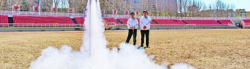 在哈尔滨工业大学体育场,航模协会的学生操控航模点火发射。新华社发