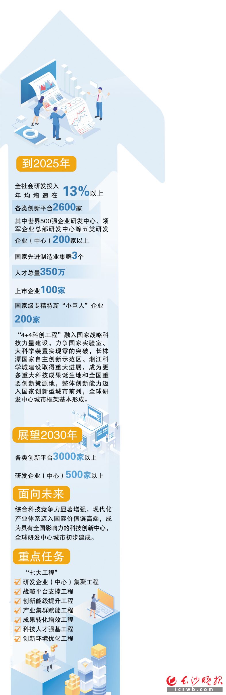 《实施意见》立足持续放大长沙强大的创新基因、丰富的科教资源、特色鲜明的产业基础和宜居宜业的城市环境等比较优势,聚焦研发平台能级、研发成果转化等方面的问题短板,在“重点任务”中绘制了详细的“路线图”——“七大工程”,即研发企业(中心)集聚工程、战略平台支撑工程、创新能级提升工程、产业集群赋能工程、成果转化增效工程、科技人才强基工程、创新环境优化工程。