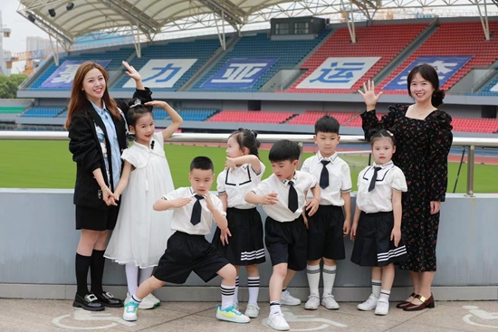 浙江省杭州市丁信幼儿园教师徐元凤(右一)与孩子们一起迎亚运。受访者供图