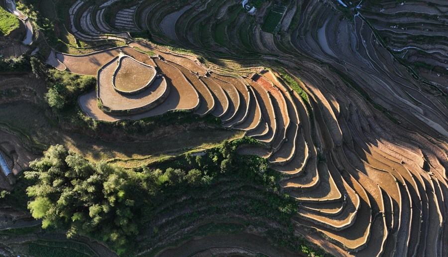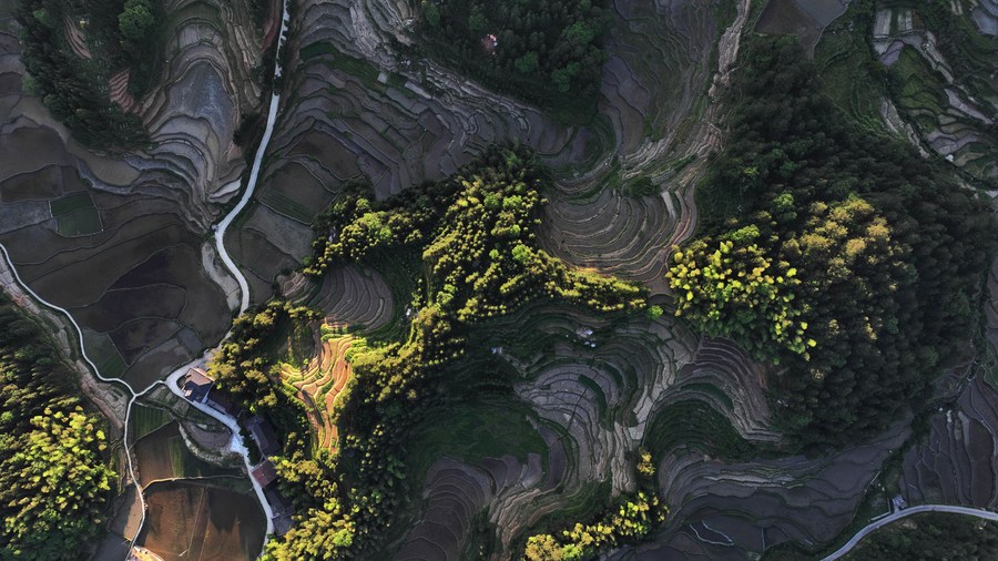 图为5月17日拍摄的夕阳映照下的紫鹊界梯田(无人机照片)。新华社记者 赵众志 摄