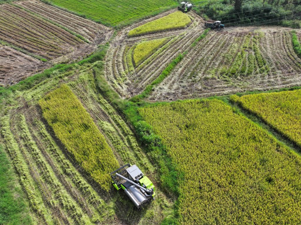 图为湖南省浏阳市沿溪镇建设村水稻收割画面(无人机照片)。 新华社记者陈泽国 摄