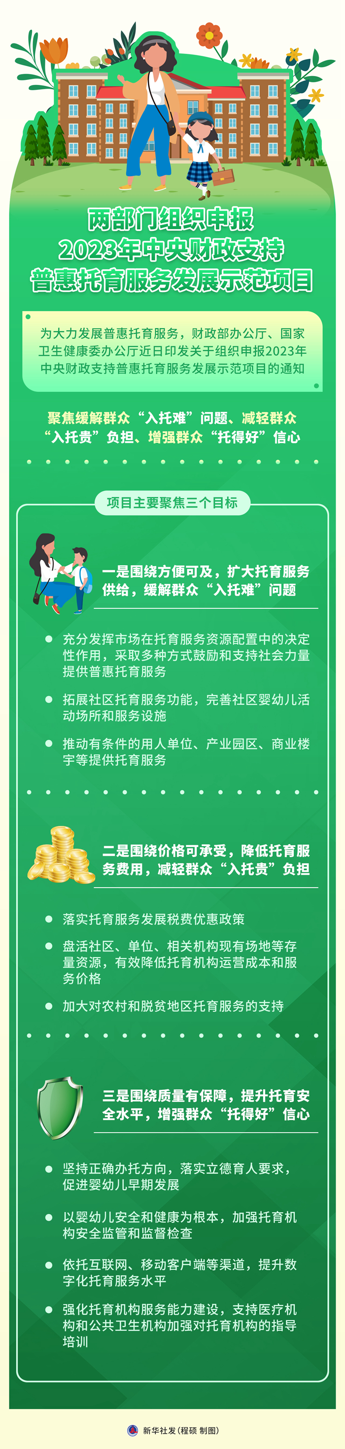 新华社北京11月28日电 为大力发展普惠托育服务,财政部办公厅、国家卫生健康委办公厅近日印发关于组织申报2023年中央财政支持普惠托育服务发展示范项目的通知,聚焦缓解群众“入托难”问题、减轻群众“入托贵”负担、增强群众“托得好”信心。