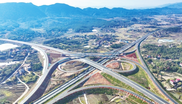 11月28日,俯瞰衡永高速与二广高速互通枢纽,纵横交错的高速路网与生态乡村构成美丽的景观。目前,衡永高速公路主体工程基本完成,已全面进入扫尾阶段,预计明年5月建成通车。雷中祥 蒋凌志 摄影报道