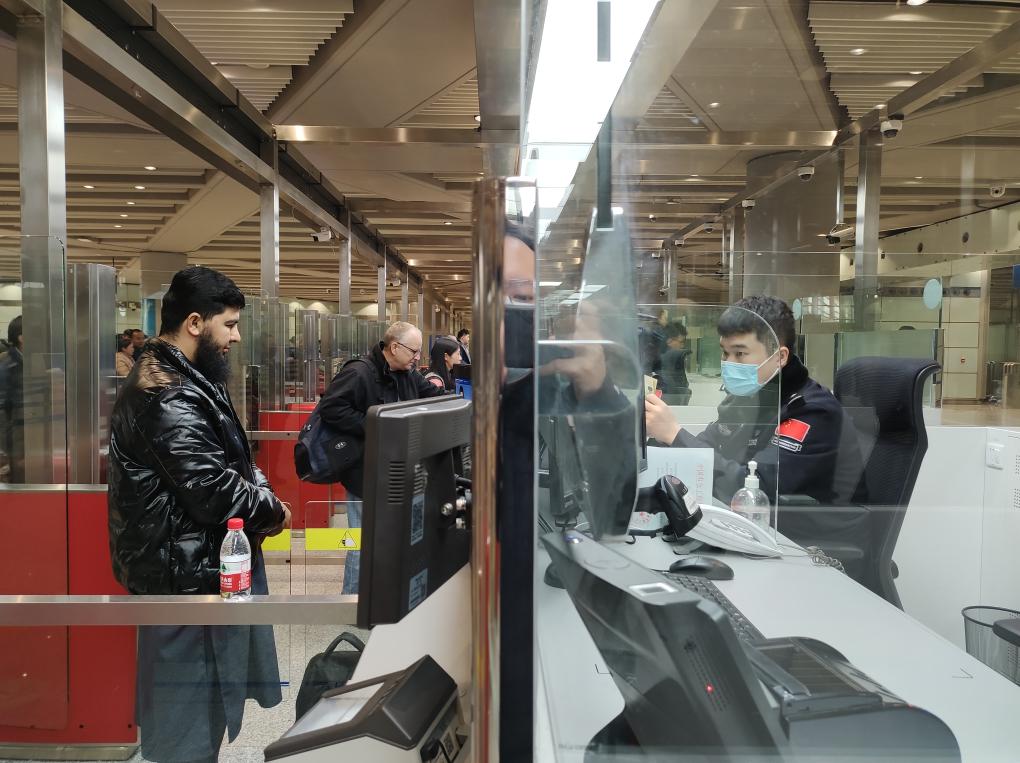 1月2日,北京边检总站移民管理警察为入境旅客办理边检手续。(北京边检总站供图)