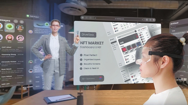 马栏山视频文创园平行视界项目概念图。通过该技术,身处异地的双方戴上专用眼镜后,不仅能“面对面”畅聊,还可演示PPT,看电影。企业供图