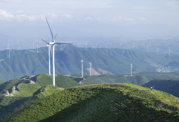 江华瑶族自治县西边大岭风力发电场,风机与秀美青山、蓝天白云相映衬,景美如画。蒋克青 杨丁香 摄影报道(湖南图片库)