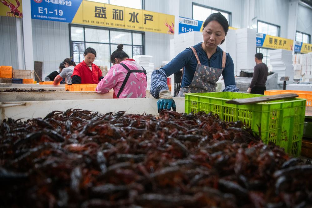 2024年4月30日,在位于湖北省潜江市的中国小龙虾交易中心,工作人员分拣小龙虾。新华社记者 伍志尊 摄