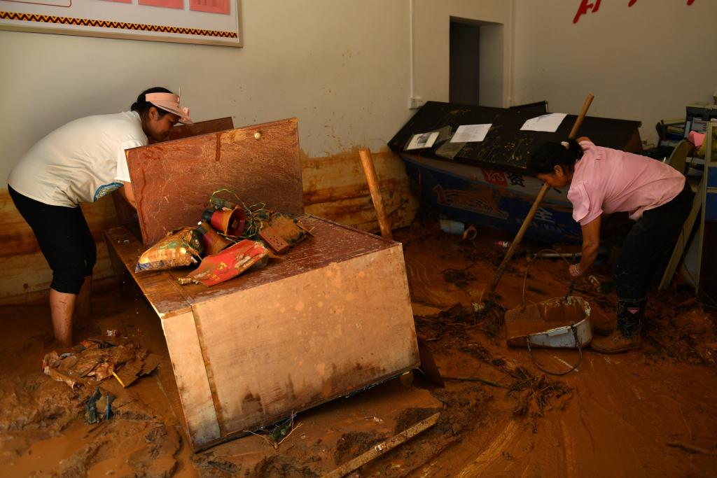 在烟坪村完全小学,校长陈鹏和教师李颖正在清理淤泥。“机械设备暂时进不来,我们3名教职工正加班加点人工清淤。工程量非常大,还有几名老师正在赶来。”陈鹏说,清淤只是第一步,后续还需要排险、消杀。“我们要加快进度,保障学生正常开学。”