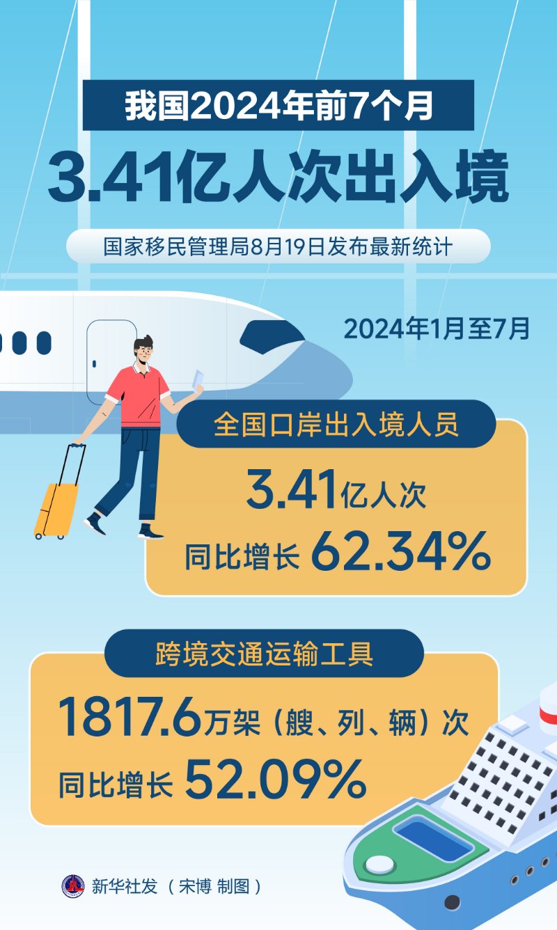 新华社北京8月19日电(记者任沁沁、余俊杰)国家移民管理局19日发布最新统计,今年1月至7月,全国口岸出入境人员3.41亿人次,同比增长62.34%,跨境交通运输工具1817.6万架(艘、列、辆)次,同比增长52.09%。