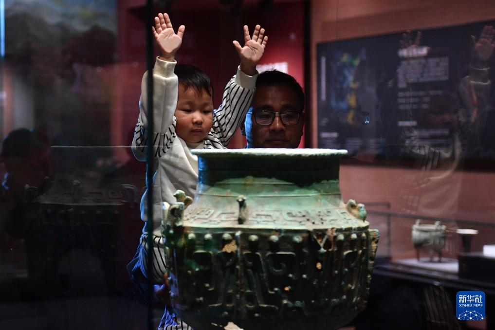 5月10日,小朋友在岳阳市博物馆观看展品介绍。