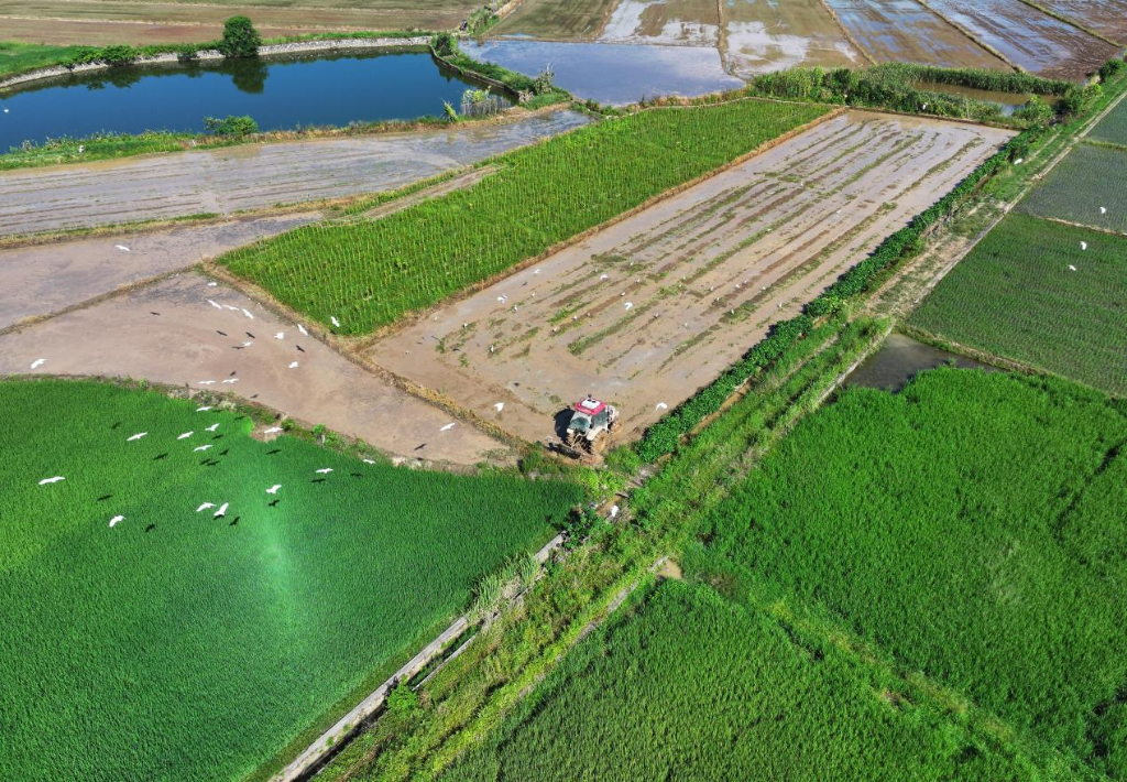 湖南省常宁市兰江乡兰江村,农民驾驶拖拉机在田间翻耕作业(无人机照片)