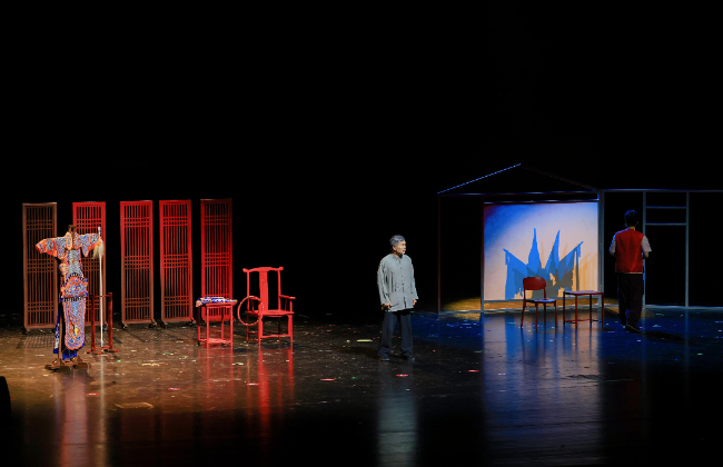 在制作上,主创团队致力于在每一场演出中持续优化精进。该剧最初版本是以山水写意风格的多媒体屏幕作为演出背景的,创排过程中为了更突出父子二人的情感疏离状态,运用道具在舞台上划分出两个物理空间,将无形的情感隔阂转化为具象的视觉呈现。在参加“群星奖”终评前,整个作品从视觉上进行了最终的修改,将中国近代京剧演员的黄忠扮相呈现在屏幕之上,恰好与台上父与子演唱京剧选段后定格的身姿重合,这一设计也体现出主创团队对中华优秀传统文化和老艺术家深厚的崇敬与传承的决心。