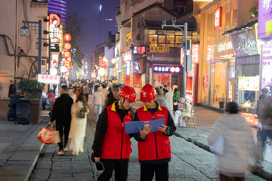 2025年12月31日晚上9:00,国网长沙供电公司(电雷锋)东方红共产党员服务队员在太平街开展节前保电特巡。新华网发 石磊摄