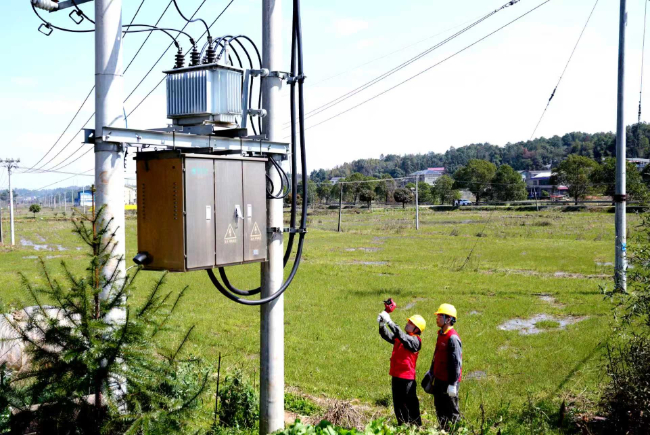工作人员对农村台区配电变压器进行红外测温。汪继生 摄