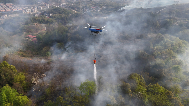 国网湖南防灾减灾中心采用自主研发无人机灭火技术开展清明节防火保障演习。国网湖南电力供图