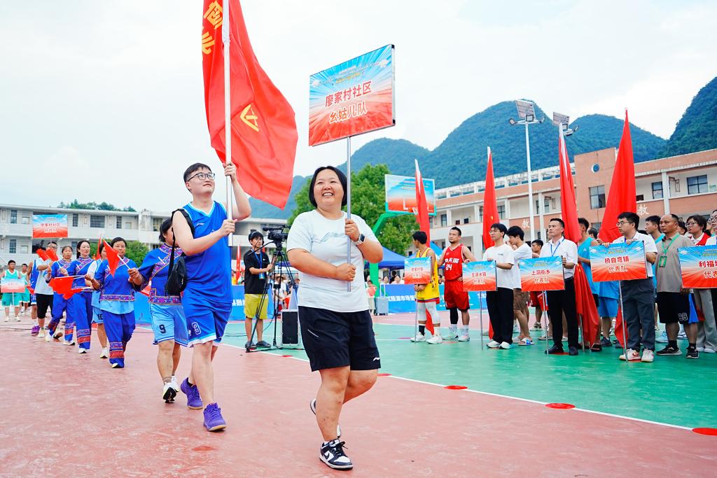这是2025年7月8日拍摄的桑植县廖家村镇“村BA”篮球赛开幕式,来自廖家村社区的幺姑儿队上场。