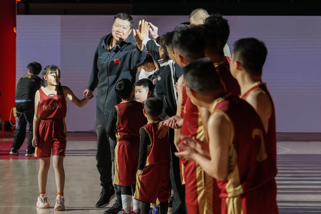 2026年4月11日,在2026年中国篮球名人堂入堂仪式系列活动“公益民星嘉年华”中,中国篮球名人堂成员匡鲁彬(左二)在入场仪式上和球员们击掌。