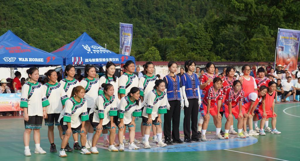这是2025年7月14日拍摄的桑植县廖家村镇“幺姑篮球赛”,双方队员和裁判员在比赛前着民族服装合影。