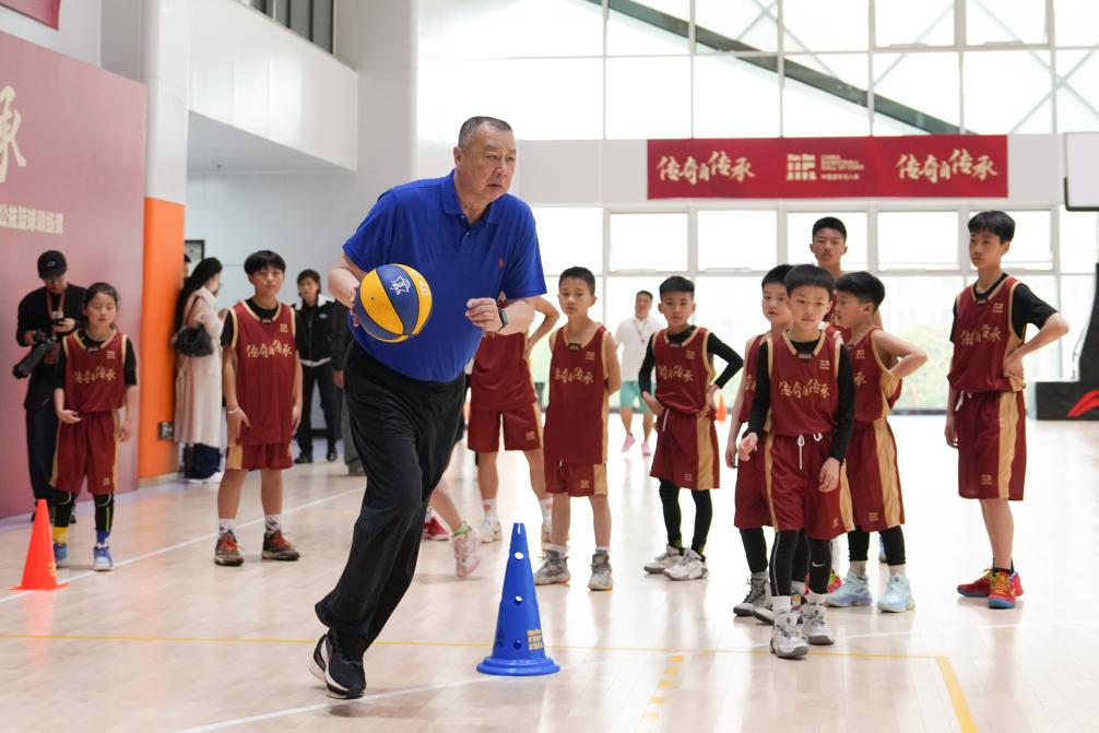 2026年4月11日,在2025年中国篮球名人堂入堂仪式系列活动公益篮球训练课中,中国篮球名人堂“优秀集体”成员吴庆龙(前)指导小球员技术动作。